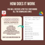 After purchase, you’ll instantly receive a PDF file containing all the download links for your 400,000 digital products. Simply open the PDF, click the links, and access everything immediately.