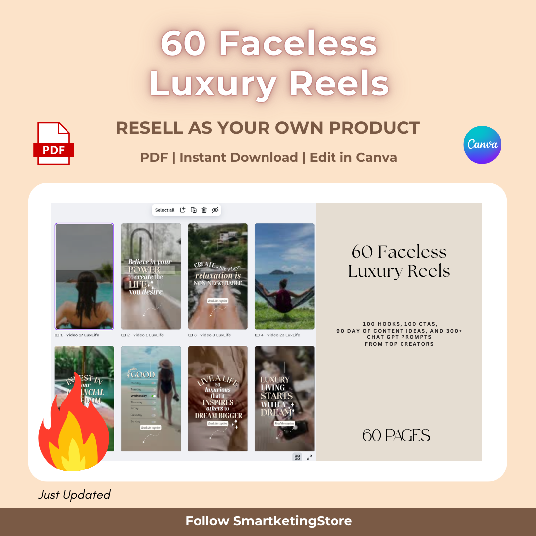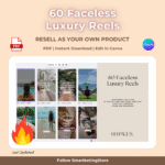 The 60 Faceless Luxury Reels is a collection of 60 short-form video templates showcasing luxury lifestyles, including exotic destinations, high-end fashion, and sleek cars, ideal for social media platforms like Instagram, TikTok, or YouTube Shorts. With Master Resell Rights, you can sell these reels as your own and keep all profits, or customize them using Canva’s free platform to edit text, colors, and video clips to suit your brand. Delivered instantly via secure email links, these templates require no design skills, making them perfect for entrepreneurs or content creators looking to enter the luxury content market with a ready-to-use, profitable digital product.