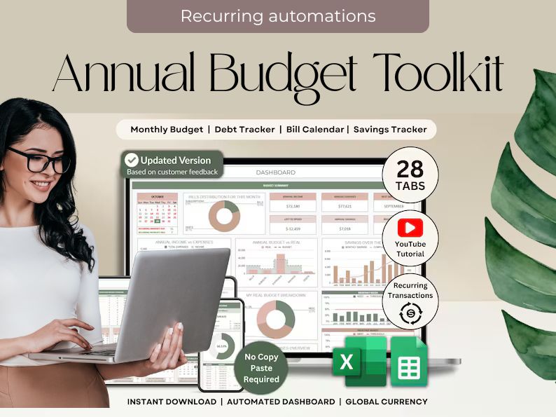Take control of your finances effortlessly with the Annual Budget Toolkit, a comprehensive and fully automated dashboard optimized for both Google Sheets and Microsoft Excel.