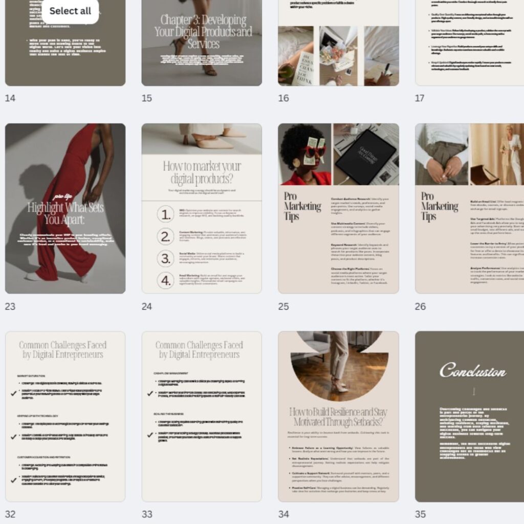 A 36-page editable Canva guide titled “How To Scale Your Digital Business,” created to assist entrepreneurs in growing beyond the startup phase. It includes advanced techniques such as identifying a profitable niche, developing digital products and services, building a strong brand, executing effective marketing, managing operations, and scaling sustainably. Delivered instantly as a PDF with a Canva link, it comes with Master Resell Rights (MRR), enabling you to customize, download, and sell it as your own while retaining 100% of the profits. This guide is perfect for anyone aiming to expand their online business in the competitive digital marketplace of 2025.