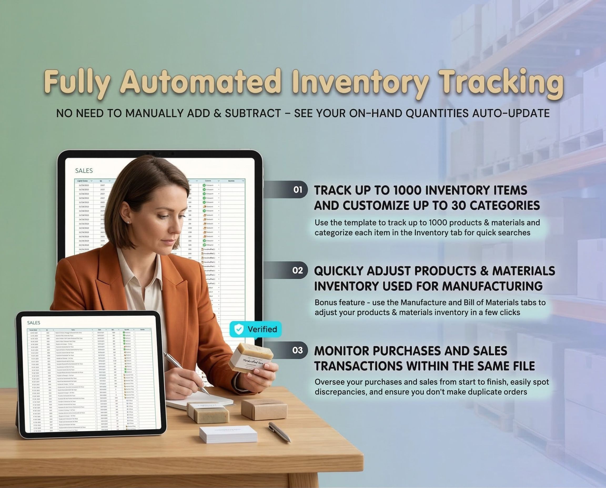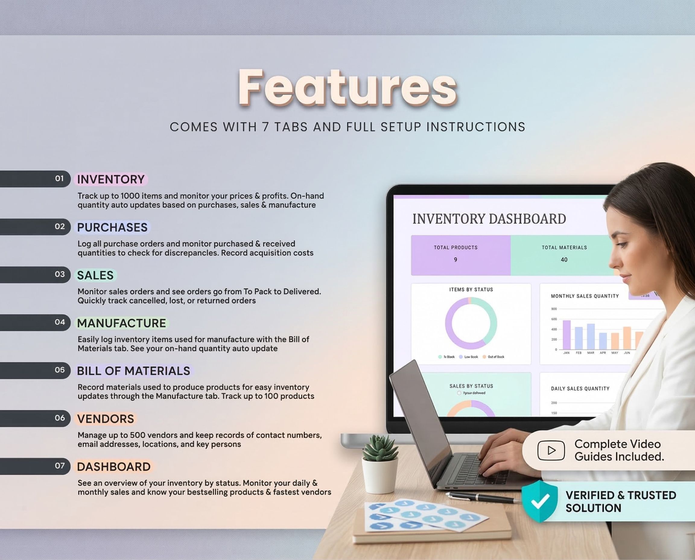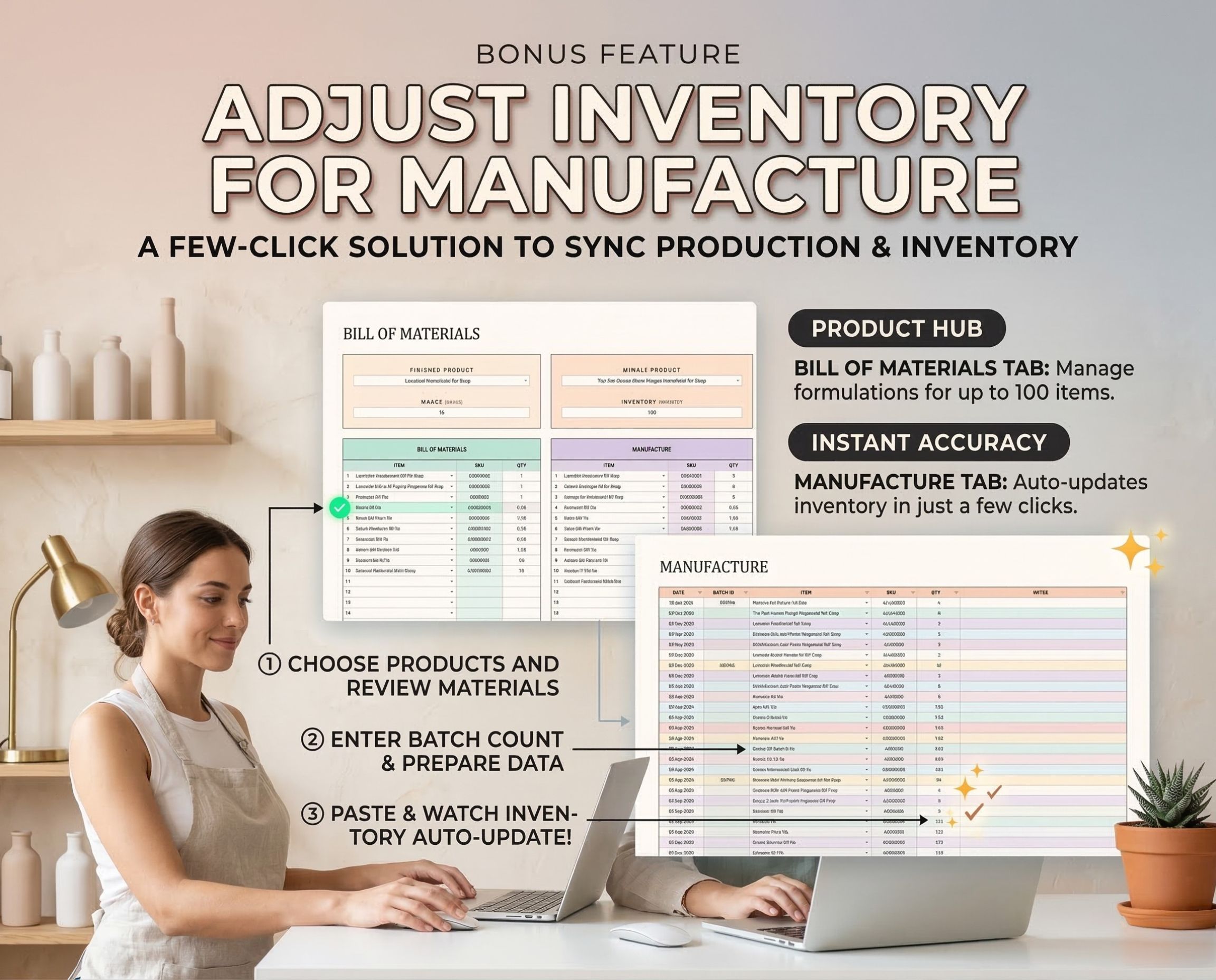 WHAT’S INCLUDED? • 7 Spreadsheet Tabs: Inventory, Purchases, Sales, Manufacture, Bill of Materials, Vendors, Setup • Full Instructions and Tips • Sample Spreadsheet with Mock Data • 16-Page Quick Start Guide • Editable in Google Sheets and Microsoft Excel