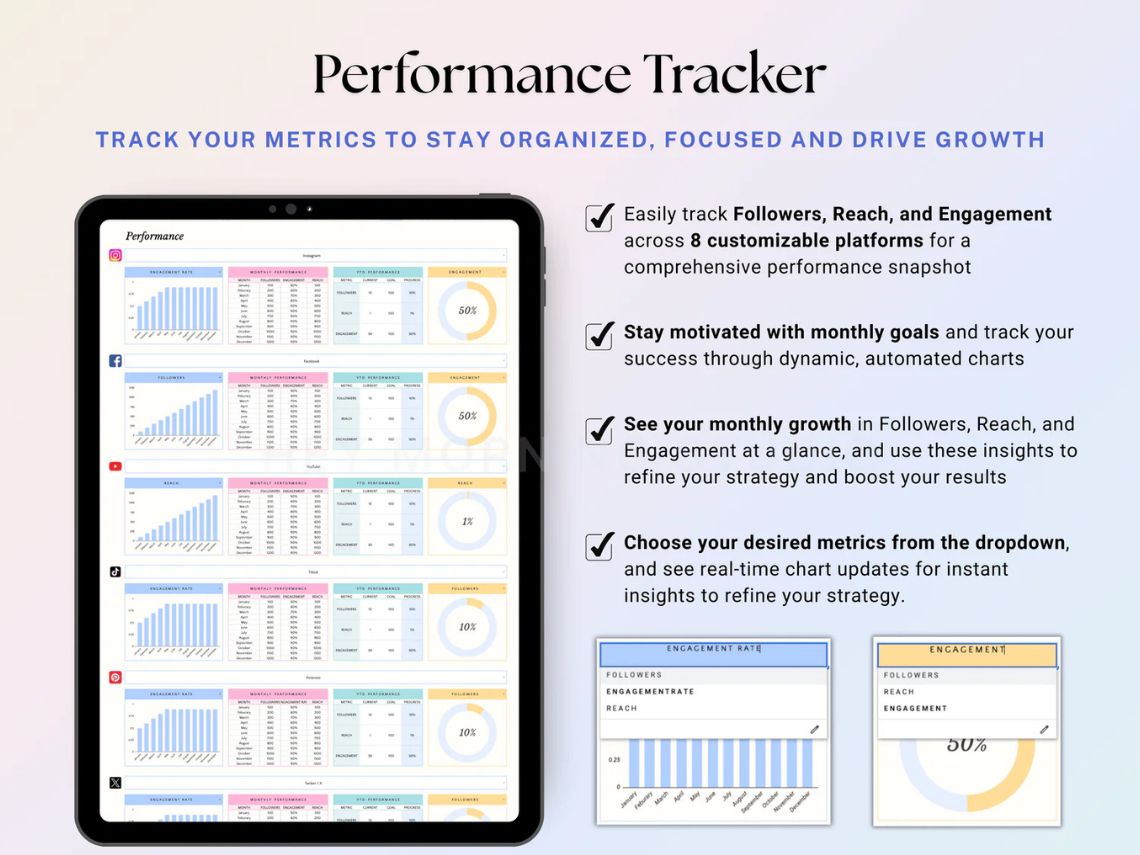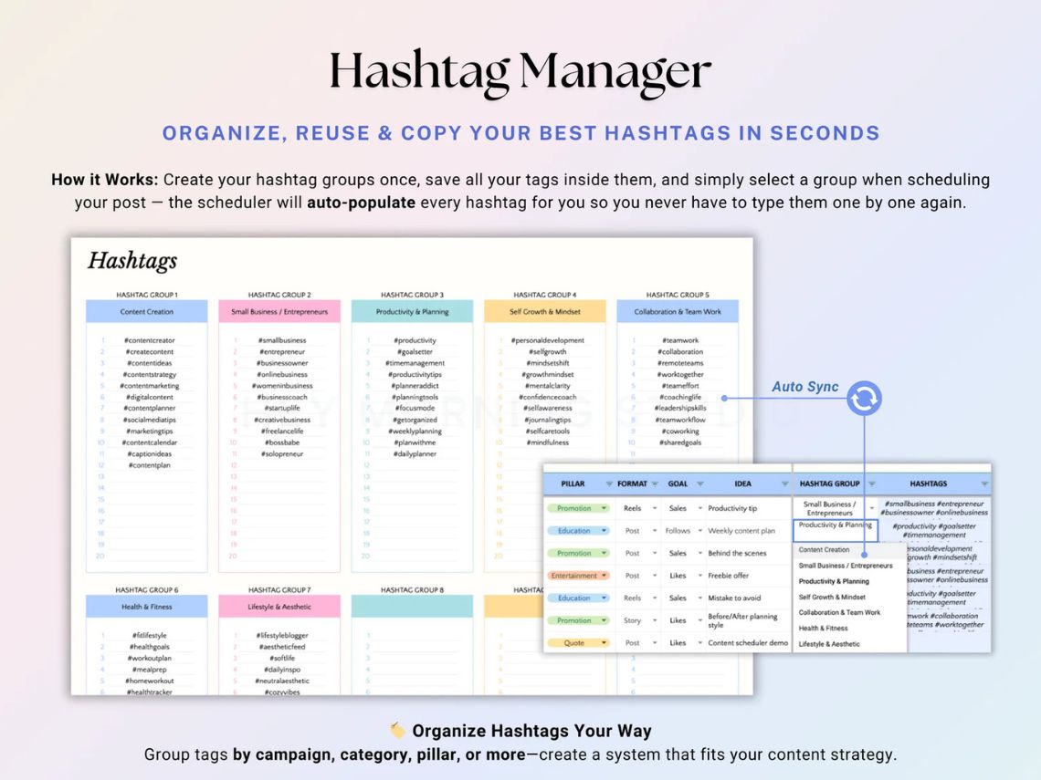 Easily organize content with the Content Scheduler, Monthly Plan, Feed Preview, and Smart Calendar, while tools like the Hashtag Manager, Performance Tracker, and Idea Bank help you stay creative, track results, and grow your audience with a structured workflow.