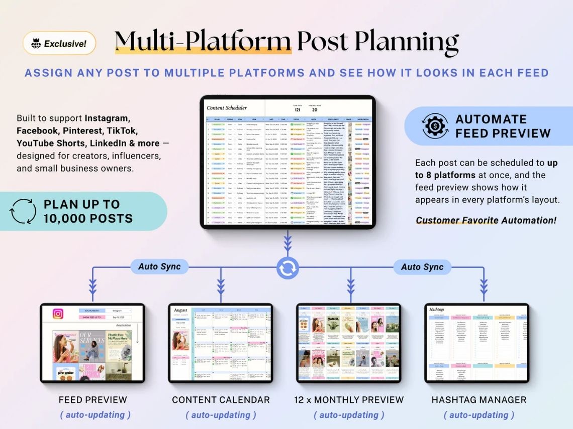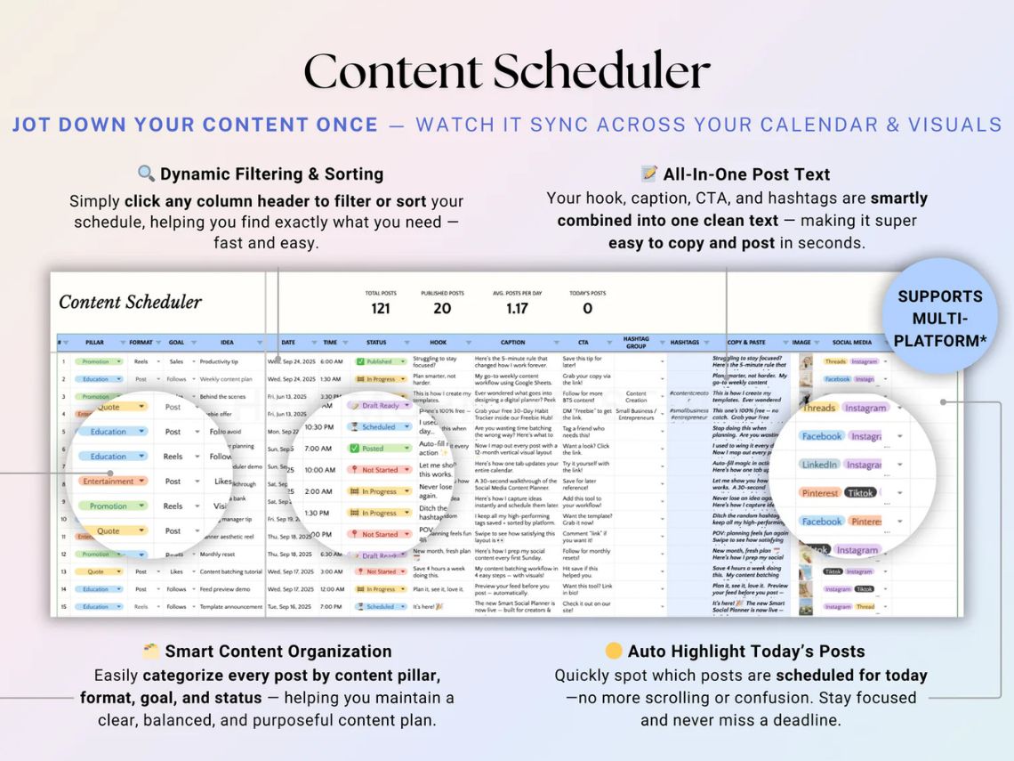 This fully automated Social Media Content Planner helps you schedule posts across multiple platforms while keeping everything clear and consistent.