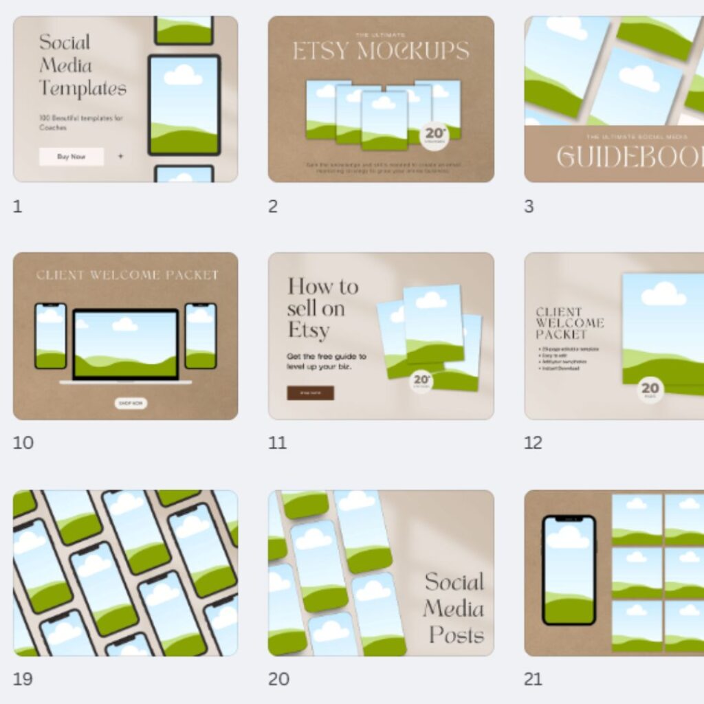 Purchase and instantly receive a PDF containing a Canva link. Customize the 21-page mockup templates with your products and branding. Download and sell the templates on Etsy, Gumroad, or your own website—keeping 100% of the profits. Use the templates to create eye-catching listings that convert visitors into buyers and grow your Etsy business effectively. Start immediately and elevate the visual quality of your product listings.
